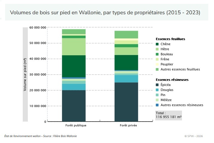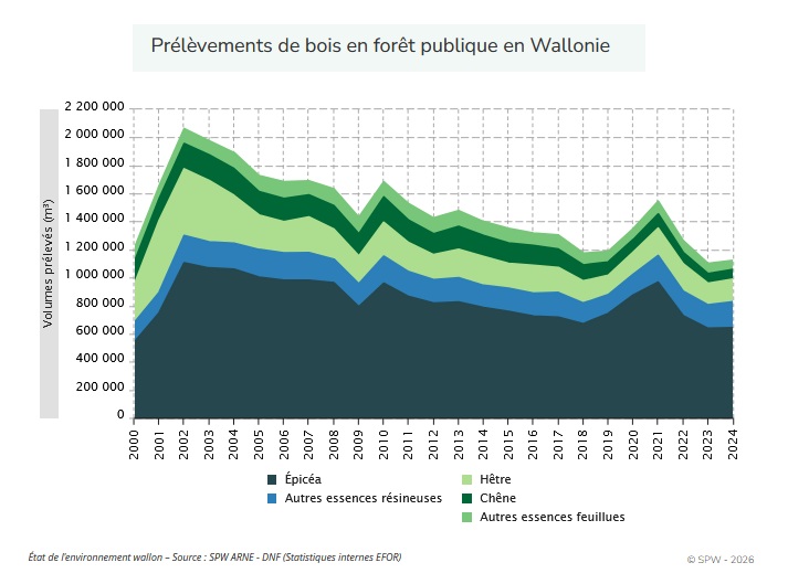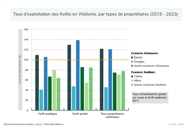 Le volume de bois sur pied représente le capital de cette ressource naturelle de la Wallonie. Sur la période 2015 - 2023, la forêt wallonne était légèrement sous-exploitée (taux d’exploitation de 98 %).
